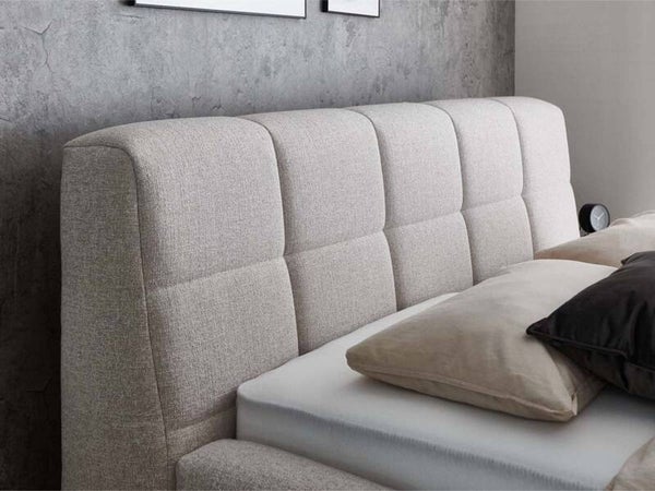 De zachte, lichtbeige bekleding zorgt voor een warme, uitnodigende sfeer, terwijl de ruime afmetingen bijdragen aan een slaapervaring die doet denken aan een luxe hotelovernachting. De subtiele, horizontale stiknaden in het hoofdbord en langs het frame voegen structuur en een elegant detail toe.