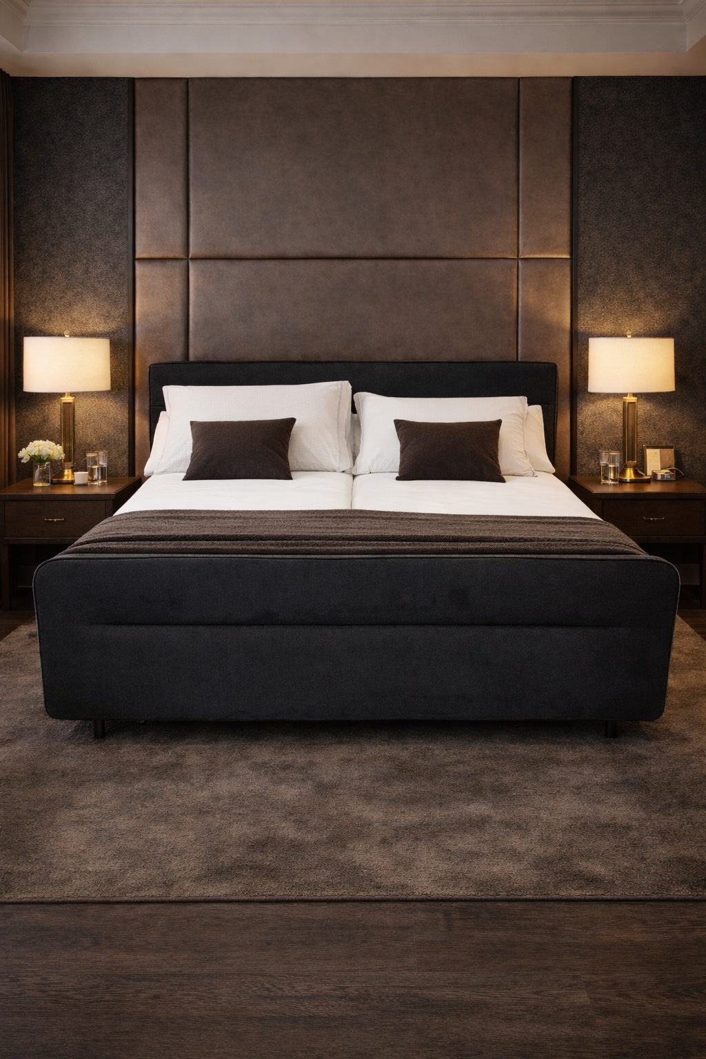 Strakke box met een recht hoofdbord met decoratieve bies, waardoor het lijkt op een luxe kussen in een grovere stof. De slanke zwarte stalen poten geven het ontwerp een moderne, elegante uitstraling.